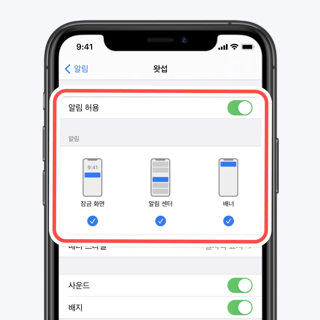 화면 위쪽의 알림 허용을 켜고, 아래의 잠금 화면, 알림 센터, 배너를 모두 켜 주세요! 이제 앞으로 왓섭이 보내는 알림이 잘 표시될거에요!